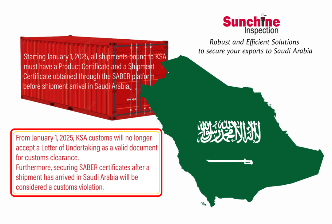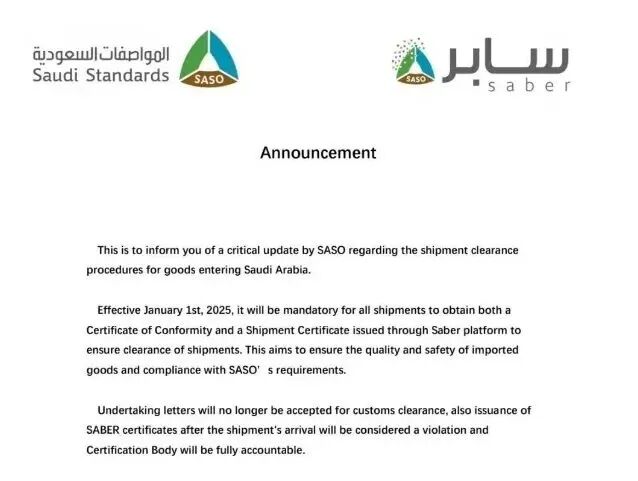 根据SASO的最新通知,自2025年1月1日起,所有出口至沙特的货物必须遵守以下新规: