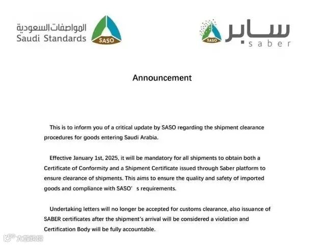 据沙特标准局SASO的最新通知,自2025年1月1日起,所有出口至沙特的货物必须通过SABER系统提交申请并取得:PCoC(产品符合性证书)以及SCoC(Shipment Certificate批次证书)。