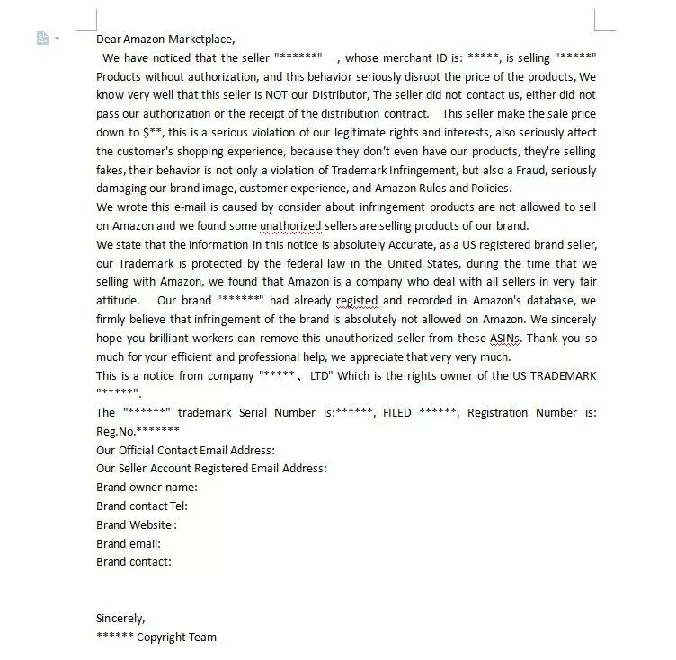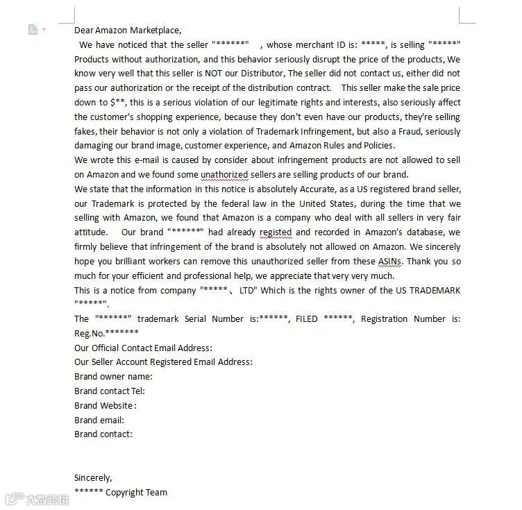但是,值得注意的是,不可以完全模仿模板,要适当的更改一下内容,不然会适得其反。可以将自己的品牌网站,电话号码,店铺注册邮箱具体的写在上面,增加获胜率。如果投诉成功的话,就会收到amazon的邮件回复。