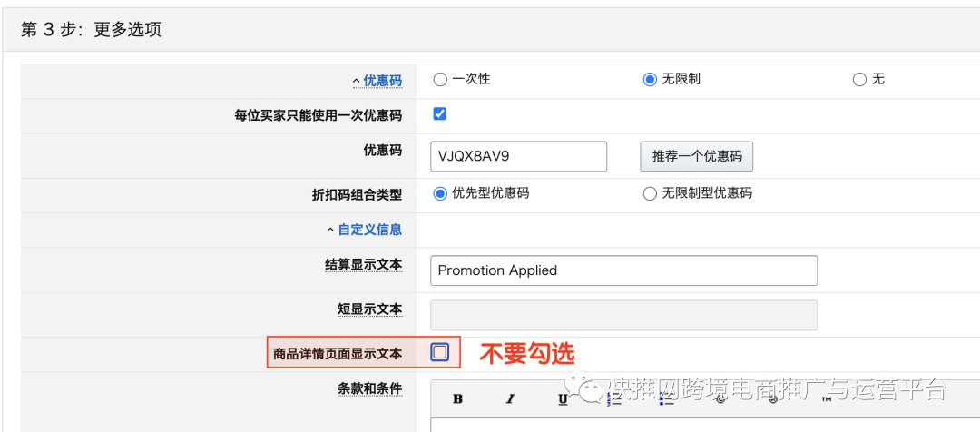 如果大家要用亚马逊“购买折扣”(Promo Code)进行站外促销,务必记得不要让折扣在前台显示,同时要注意同一个产品是否有生效的Coupon,避免让客户钻空子让多个折扣同时生效而造成0付款买空了你的库存。