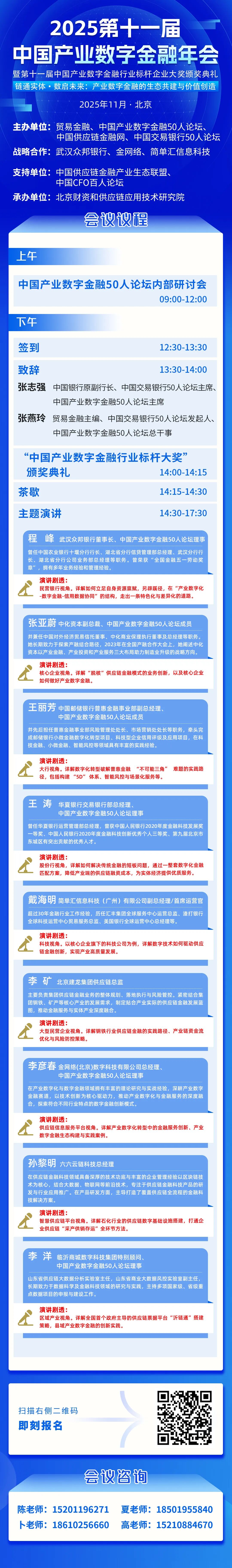 当下,新一轮科技革命与产业变革加速推进,产业数字金融作为促进经济增长的新引擎,历经传统产业金融1.0、供应链金融2.0到数字金融3.0阶段,已形成覆盖全产业链的生态服务体系。然而,其发展仍面临技术支撑不足、监管模式滞后等挑战。为此,2025第十一届中国产业数字金融年会将于11月在北京举办,聚焦产业数字化与金融创新融合趋势,汇聚政府、企业、金融机构等各方力量,探讨行业痛点与解决方案,推动构建良性金融生态,助力产业链协同发展。