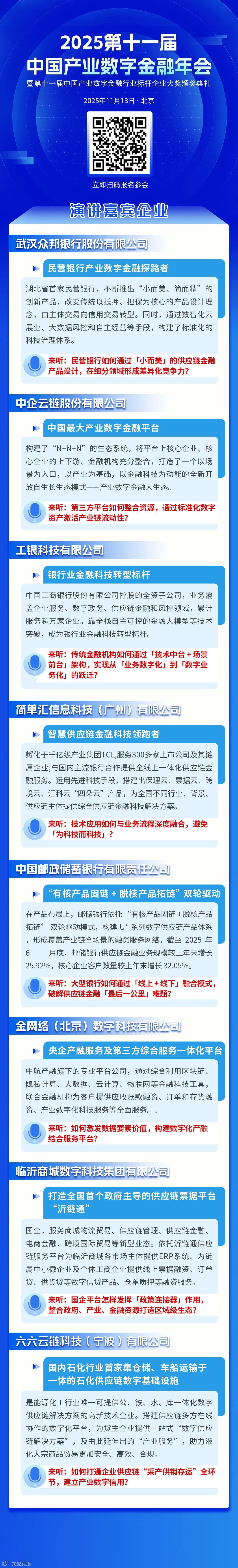 当下,新一轮科技革命与产业变革加速推进,产业数字金融作为促进经济增长的新引擎,历经传统产业金融1.0、供应链金融2.0到数字金融3.0阶段,已形成覆盖全产业链的生态服务体系。然而,其发展仍面临技术支撑不足、监管模式滞后等挑战。为此,2025第十一届中国产业数字金融年会将于11月在北京举办,聚焦产业数字化与金融创新融合趋势,汇聚政府、企业、金融机构等各方力量,探讨行业痛点与解决方案,推动构建良性金融生态,助力产业链协同发展。