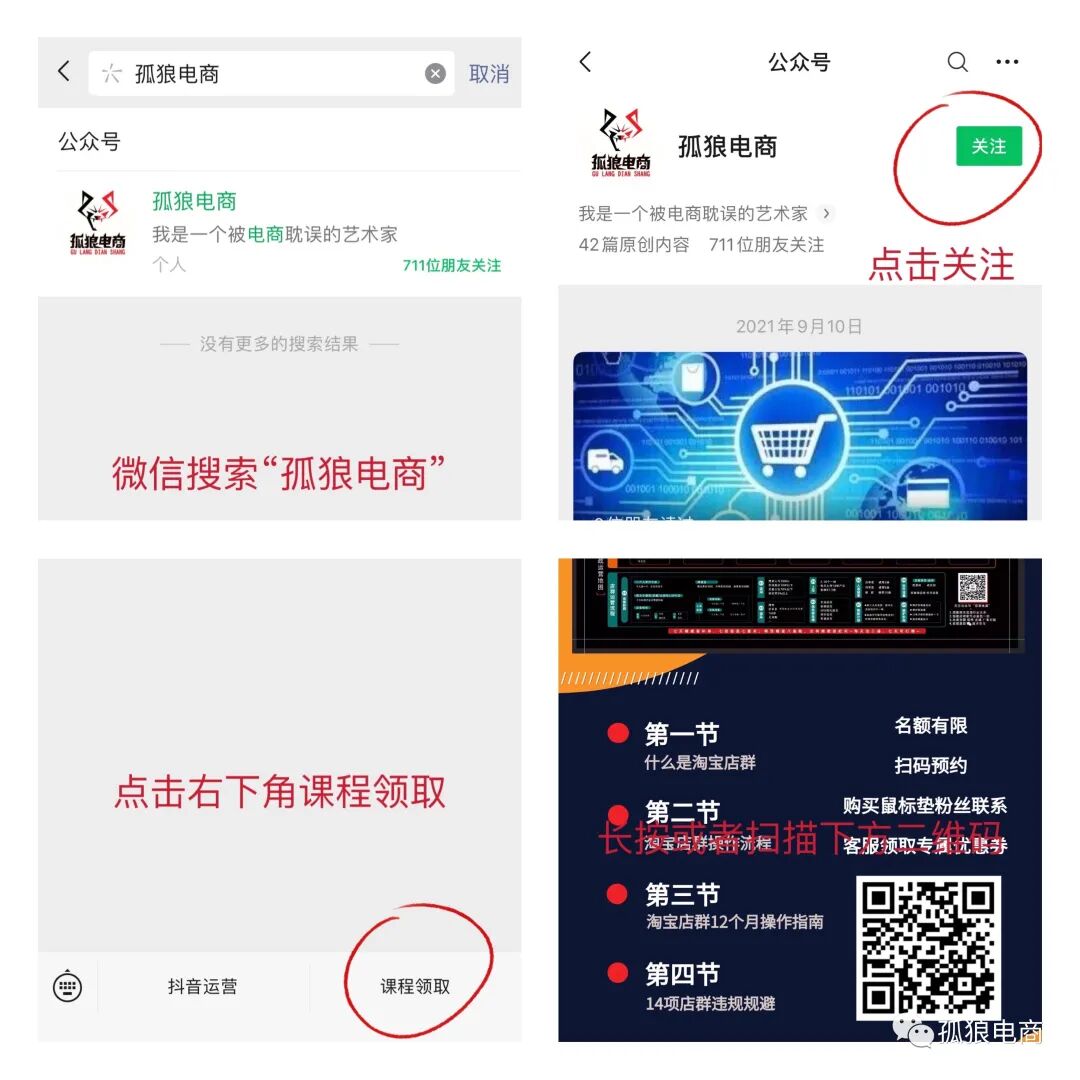 微信扫描鼠标垫右下角二维码关注“孤狼电商”公众号或者直接微信搜索“孤狼电商”。以下是操作流程: