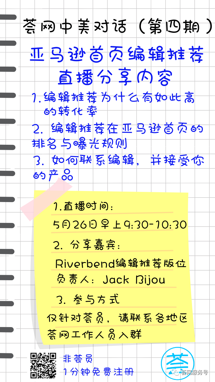 【重要直播-中美对话】(5月26日早上9:30-10:30)亚马逊首页编辑推荐刊登方式与注意事项,荟员请联系荟网工作人员入群接收链接。非荟员请扫码参与