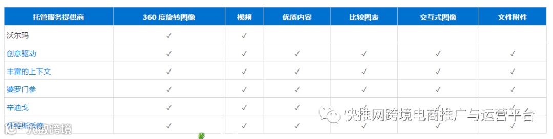 沃尔玛为选定类型的富媒体资产提供托管服务。我们还与多家提供富媒体资产托管的内容服务提供商合作。下表显示了服务提供商以及他们可以为 Walmart 列表托管哪些类型的富媒体资产。