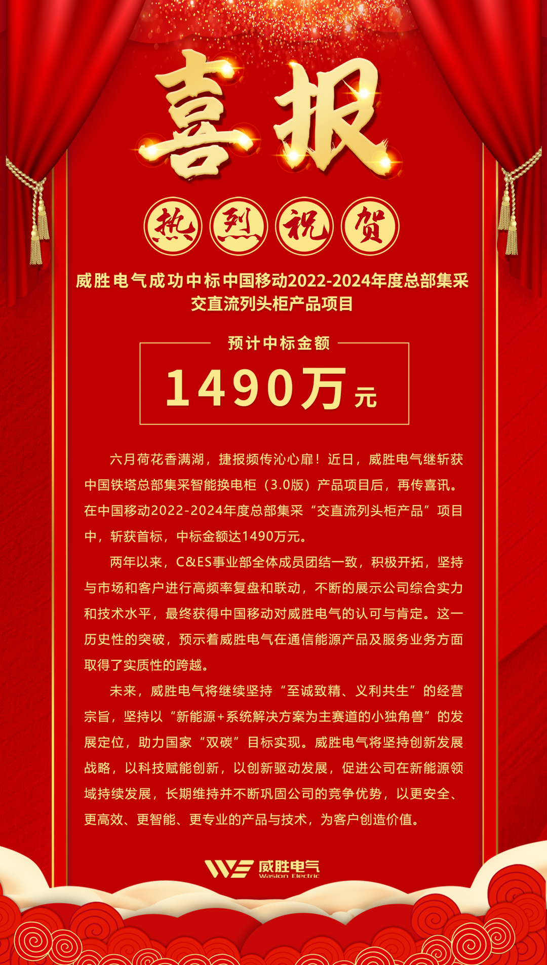六月荷花香满湖,捷报频传沁心扉!近日,威胜电气继斩获中国铁塔总部集采智能换电柜(3.0版)产品项目后,再传喜讯。在中国移动2022-2024年度总部集采“交直流列头柜产品”项目中,斩获首标,中标金额达1490万元。