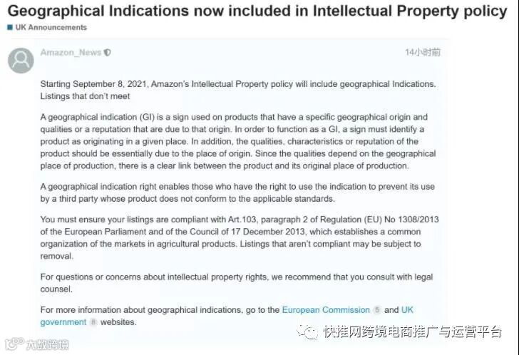 亚马逊平台政策不断完善,不断有新的政策出台,近期亚马逊在后台更新了一则新要求即在9月8日之后,欧洲站的知识产权政策中将加入地理标示,在执行后如果该项目填写不正确,产品将可能被移除!