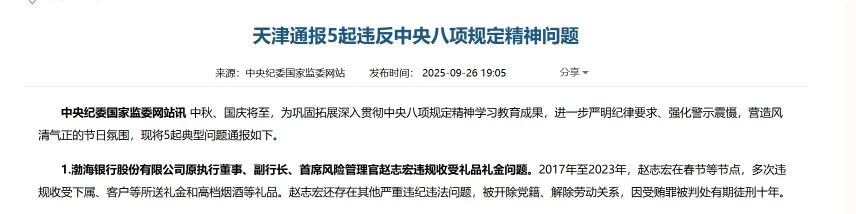 最近,天津通报5起违反中央八项规定精神问题,其中渤海银行原副行长赵志宏首次披露已经被判刑10年。