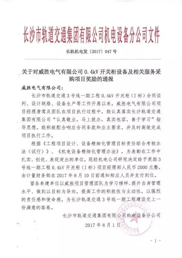 此次的奖励通报针对长沙市轨道交通集团三号线一期工程0.4kV开关柜(I标)项目。2015年9月29日,威胜电气获得该项目最大份额合同,后期在合同谈判、设计联络、设备生产等工作中,认真落实长沙市轨道交通集团有限公司“认真敬业、马上就办、真实包容、善于学习”的指导思想,积极配合响应合同条款和业主要求,并及时高效完成项目执行工作。