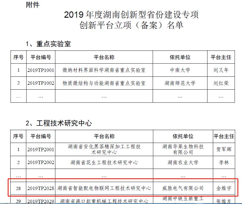 近日,湖南省科学技术厅下发了《关于2019年度湖南创新型省份建设专项创新平台立项(备案)的通知》。威胜电气凭借“智能配电物联网关键技术研究制造”获批省级工程技术研究中心 。这是威胜电气在获得湖南省企业技术中心后取得的又一重要殊荣。