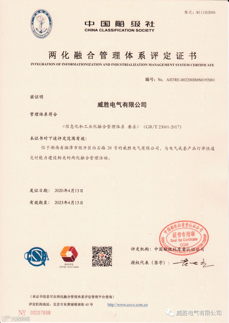 经过中国船级社专家来司评估现场审核工作,最终威胜电气顺利通过两化融合体系评估认证。并于2020年4月13日收到国家工信部签发的两化融合管理体系评定证书。