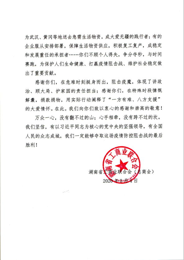 “感谢你们,在危难时刻挺身而出,阻击疫魔,体现了讲政治、顾大局、护家园的责任担当;感谢你们,在特殊时段慷慨解囊,捐款捐物,你用实际行动阐释了‘一方有难、八方支援’的大爱情怀!”
