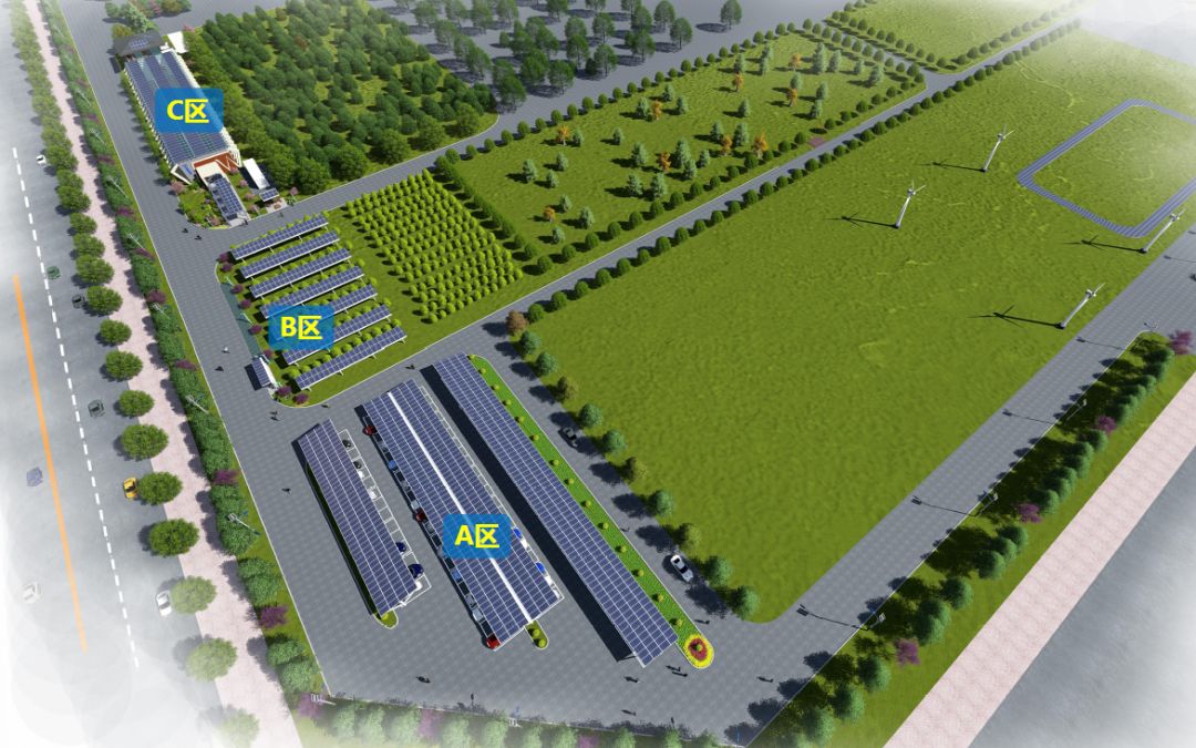 新能源应用示范项目分期建设,一期规划建设3个示范区域,位于园区西侧偏南,从南往北依次为A区光储充车棚、B区林光互补光伏电站、C区新能源应用展示中心。