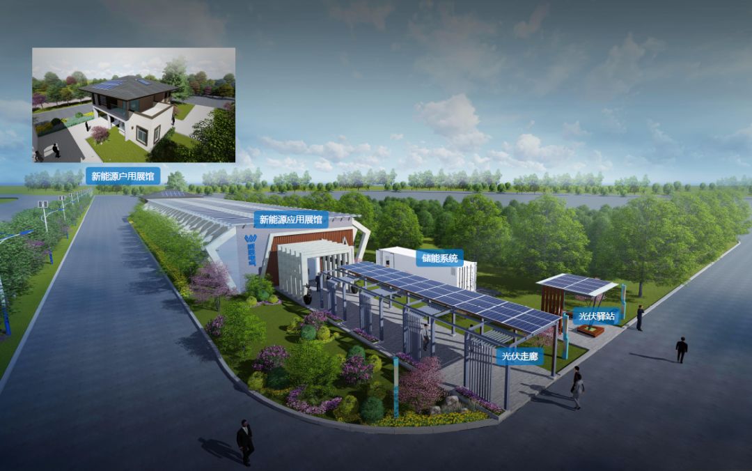 新能源应用示范项目C区包括行新能源应用展馆、新能源户用展馆和微电网系统、集装箱式储能系统、光伏走廊、光伏驿站等新能源应用示范设施。