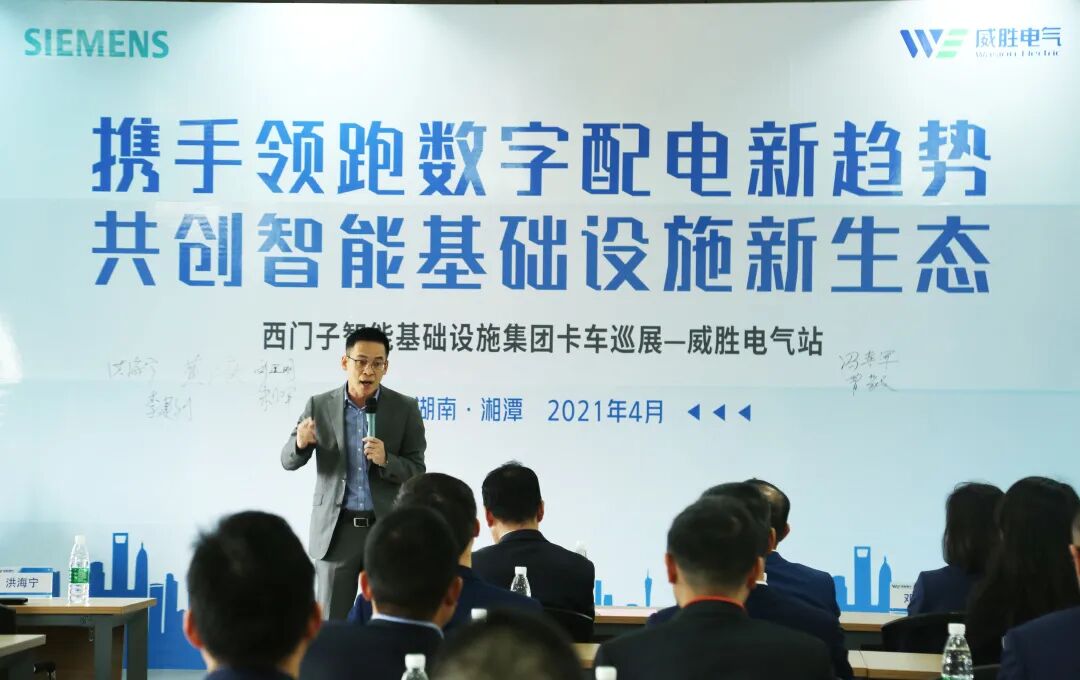 随后西门子华中区大区经理洪海宁先生上台致辞,他首先表示非常高兴此次西门子卡车巡展活动能在威胜电气举办。威胜电气是西门子在华中区域的重要合作伙伴,同时也作为一家有崇高理想使命的公司,现在已经发展成为华中区域乃至全国知名的智能配用电领域的服务专家。今天西门子也借电气智能化主题开放日这个契机,用卡车秀的形式,一方面希望把西门子智能基础设施集团的先进技术带给大家,另一方面也希望在后疫情时期加强和行业伙伴面对面沟通交流的机会。