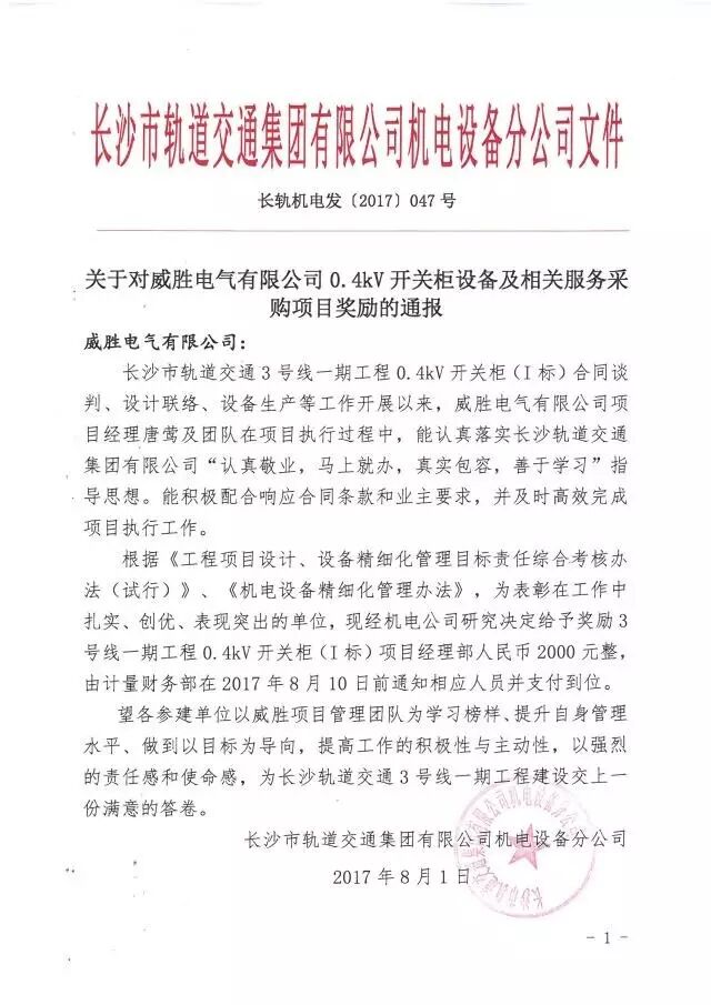 2017年8月1日,威胜电气受到长沙市轨道交通集团有限公司奖励通报。自长沙地铁开始建设以来,我公司是第一个得到公开奖励通报的设备厂家。