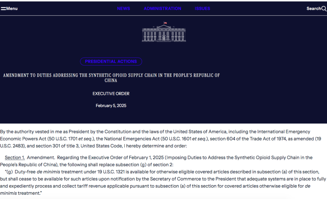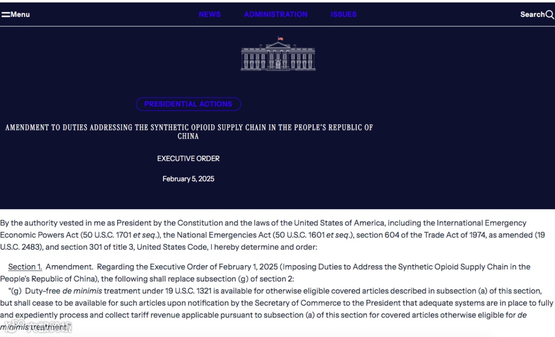 根据白宫发布新闻稿,特朗普在行政令中宣布,对来自中国小包裹的免税待遇将继续有效,直到“建立足够的系统来全面、迅速地处理和收取关税收入”。特朗普并未具体说最新行政令的有效时间。