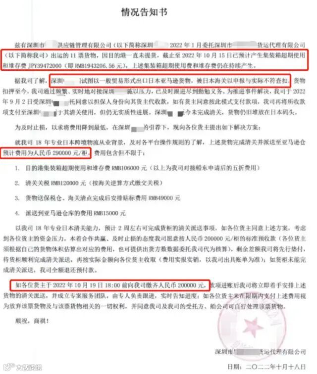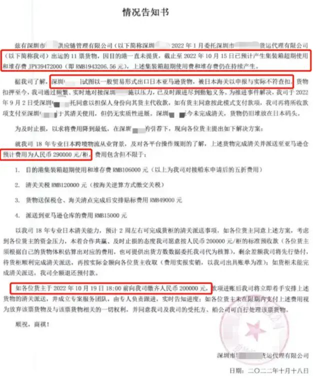 10月18日,该货代公司在《情况告知书》中表示,其于2022年1月收到一家名为深圳xx供应链同行公司的订舱委托,安排出运11票货物。因目的港一直未提货,截止至2022年10月15日,已预计产生集装箱超期使用和堆存费高达3947.2万日元(194.3万人民币),并且仍在持续增加。