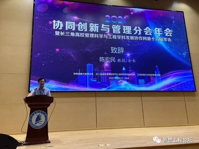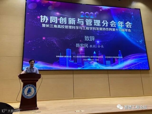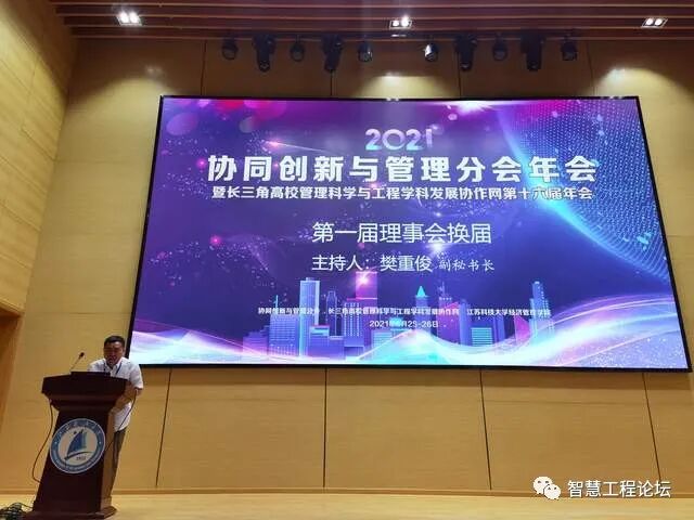 江苏科技大学党委书记葛世伦教授致辞,他向参会嘉宾详细介绍了江苏科技大学的建校历史、办学特色、管理科学与工程学科的发展情况。协同创新与管理分会第一届理事会理事长、上海交通大学陈宏民教授介绍了年会的发展历史,着重强调了本次会议在长三角管理科学与工程学科协作和创新方面所起到的重要纽带作用。樊重俊副秘书长主持了协同创新与管理分会第一届理事会换届,参会老师与同学全票通过了新一届理事会成员名单,在大家热情洋溢的掌声中,新任理事长浙江大学周伟华教授上台致辞,阐述了协同创新与管理分会的未来发展设想。
