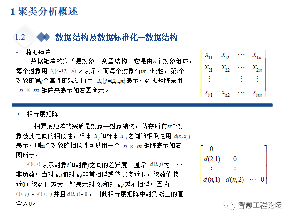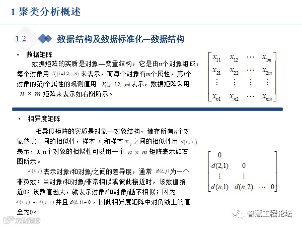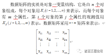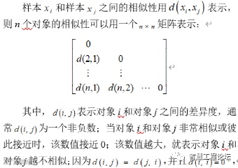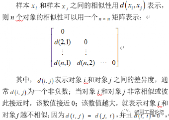 相异度矩阵的实质是对象一对象结构,储存所有n个对象彼此之间的相似性。
