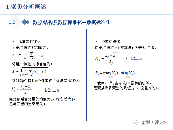由于变量表示样本的各种性质,往往使用不同的度量单位,其观察值也可能相差比较大。这样,绝对值大的变量可能会湮没绝对值小的变量,使后者应有的作用得不到反映。为了确保各变量在聚类中的地位相同,可以对数据进行标准化变换,常用的有三种变换方法: