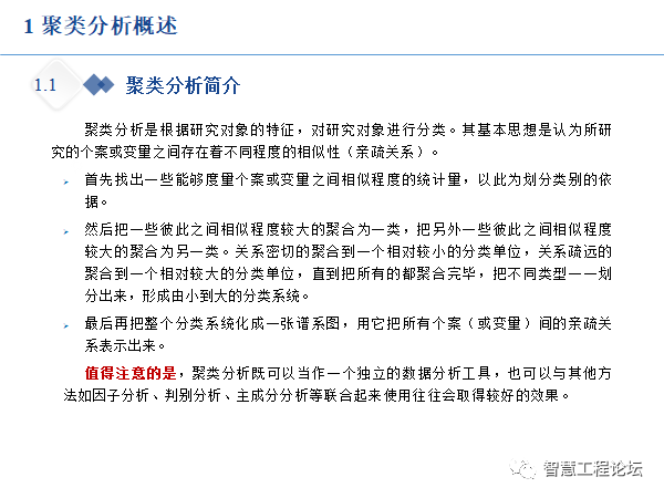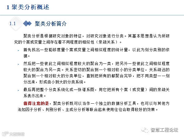 值得注意的是,聚类分析既可以当作一个独立的数据分析工具,也可以与其他方法如因子分析、判别分析、主成分分析等联合起来使用往往会取得较好的效果。