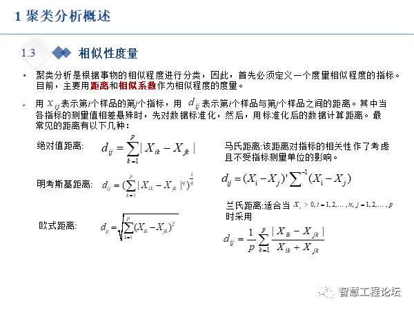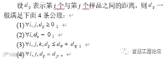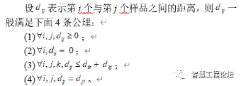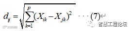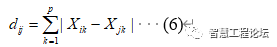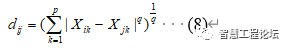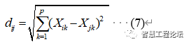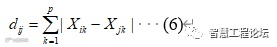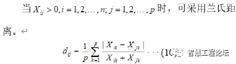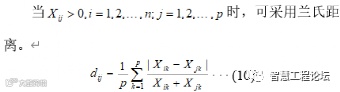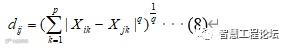 个样品与第j个样品之间的距离。其中当各指标的测量值相差悬殊时,先对数据标准化,然后,用标准化后的数据计算距离。最常见的距离有以下几种: