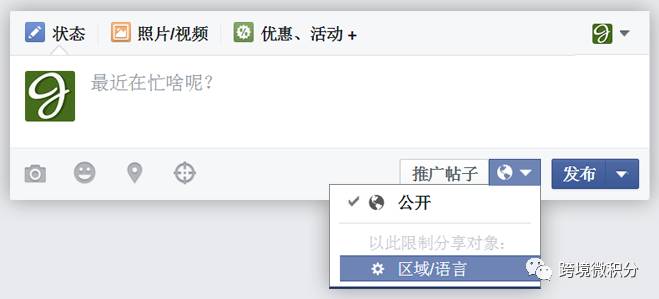 ● 点击“公开”按钮,然后选择“区域/语言”。选择显示帖子的地区和分享对象所使用的语言。