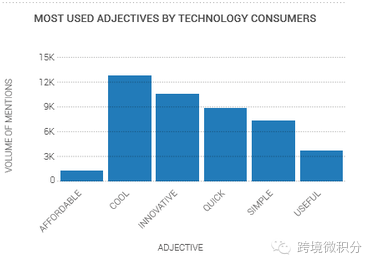 大部分科技产品消费者在提及品牌时会使用如“cool(酷)”和“innovative(创新性的)”等形容词。而“affordable(买得起)”是消费者最不经常用到的词。
