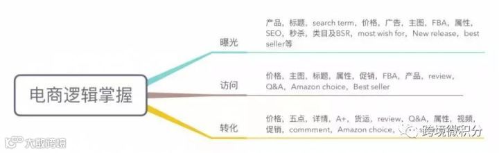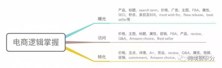 我把在亚马逊运营里哪些因素跟曝光相关,哪些因素跟曝光、访问、转化相关都列上面这张图里,这些应该是每个做电商的人都需要进行梳理和思考的一个基础逻辑。
