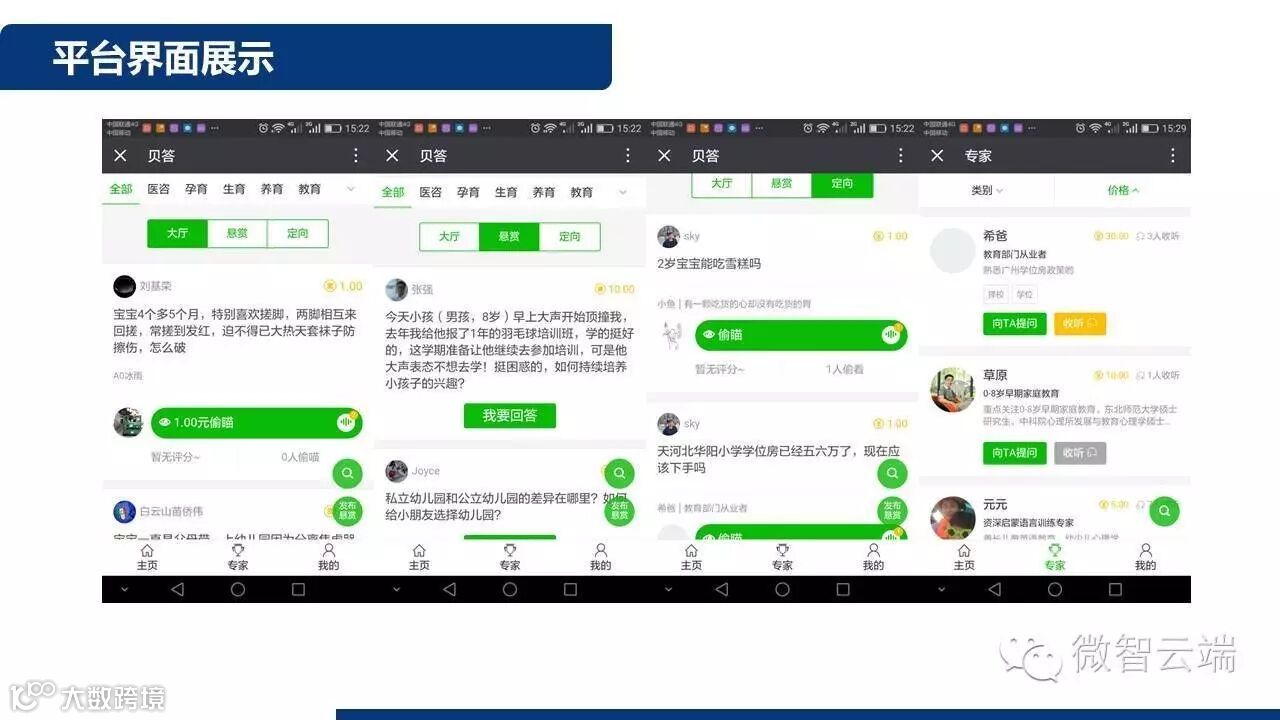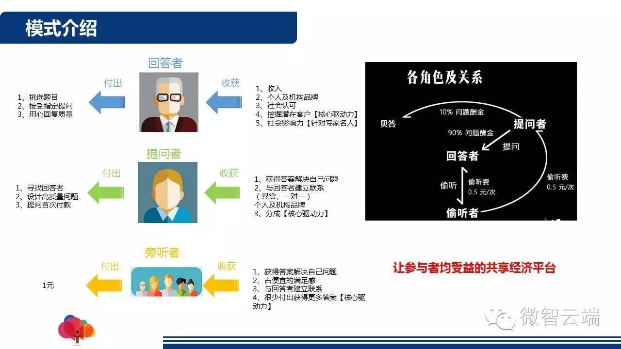 贝答是一个关于孩子养育教育的经验与知识有偿问答平台,家长们关于孩子的教育养育问题,可以在贝答上发布悬赏或者指定向专家提问,并支付一定的酬金(自己定义),一旦有人回答你的问题,酬金就归回答者所有。这是最基本的有偿问答,贝答的精髓还在于有一个偷听功能,当某个问题被别人偷听一次偷听者会支付1元钱,那么提问者和回答可以各自获得50%偷听费分成。在这样的模式下,实现了提问者、回答者、偷听者均受益的知识共享经济。下面我们用一张图来解释: