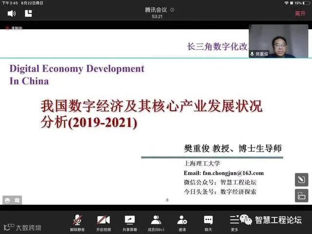 上海理工大学博士生导师、智慧工程研究中心主任樊重俊教授应邀参加论坛,并做了题为《我国数字经济及其核心产业发展状况分析(2019-2021)》的报告。