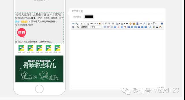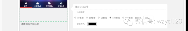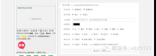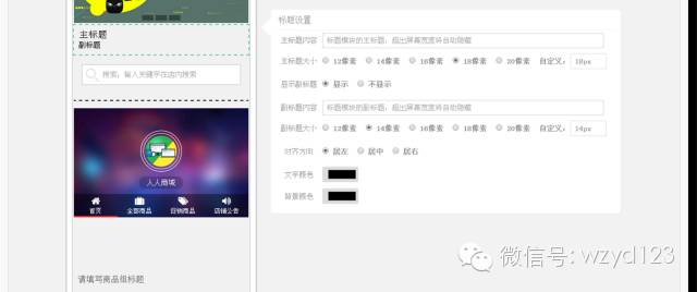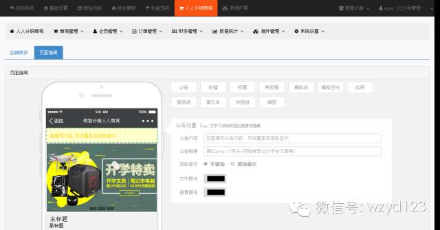3、组件设置,包括公告、轮播、标题、搜索框、辅助线、辅助空白、店招、商品组、富文本、按钮组、单图组件功能设置