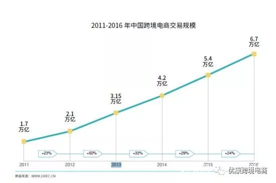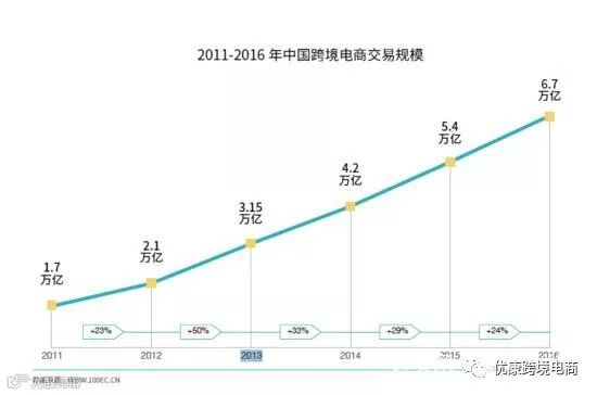在市场规模方面,中国出口跨境电商行业经历了多年的发展,尤其是2010年后的爆发式增长,目前已经形成了巨大的市场规模。《2016年度中国电子商务市场数据监测报告》报告显示,2016年中国跨境电商交易规模6.7万亿元,同比增长24%。其中,出口跨境电商交易规模5.5万亿元。