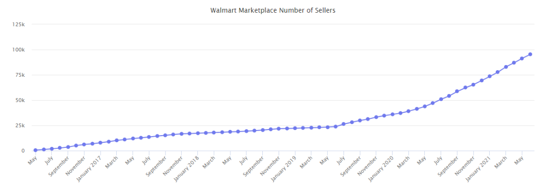 Marketplace Pulse数据显示,截至6月22日,沃尔玛市场有 95318 名卖家。今年到目前为止,已有 25970 名新卖家入驻,其中5298名是在上个月加入的。