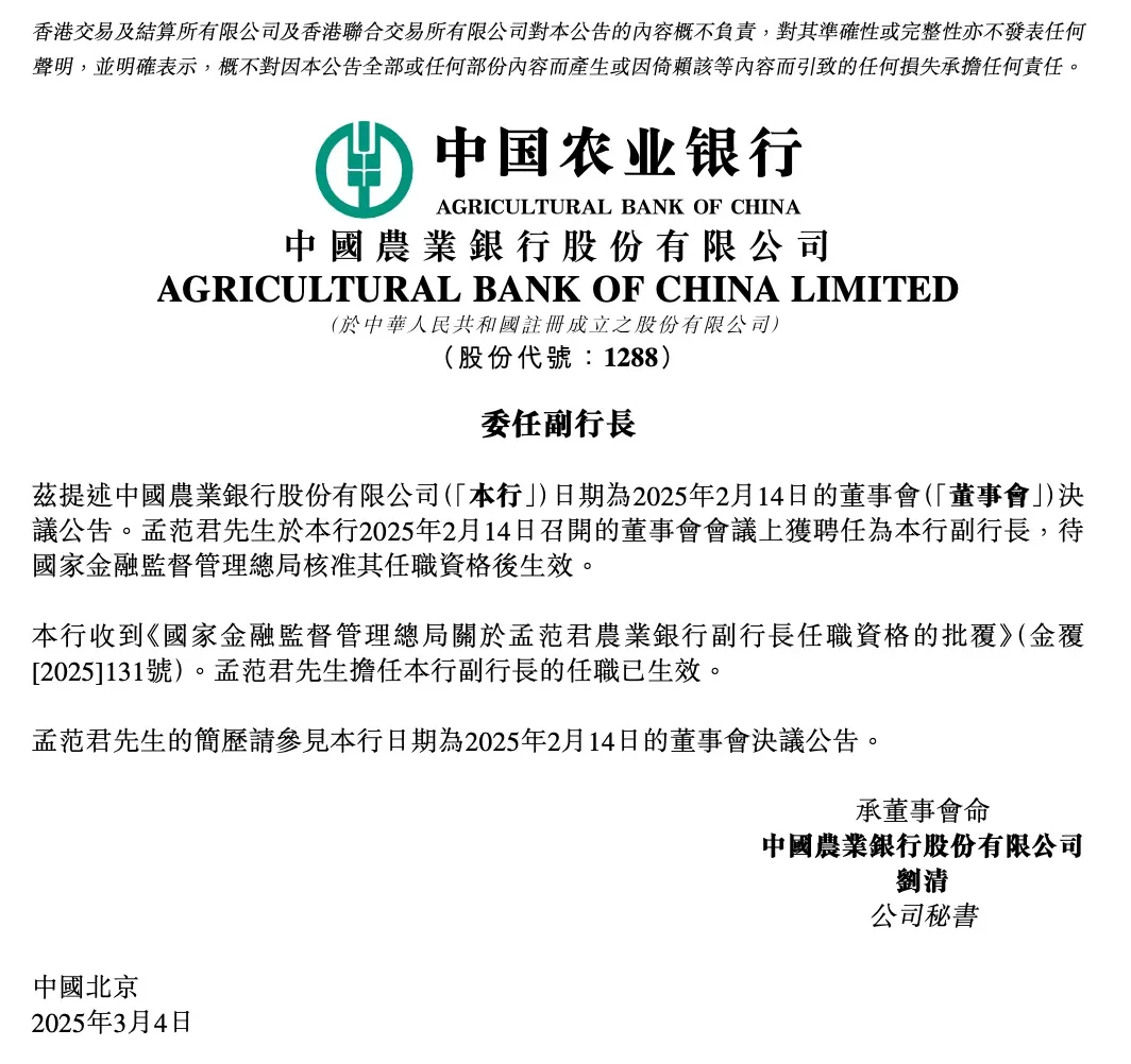 同日,农业银行发布公告称,该行收到《国家金融监督管理总局关于孟范君农业银行副行长任职资格的批复》,孟范君担任该行副行长的任职已生效。