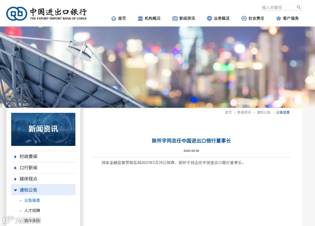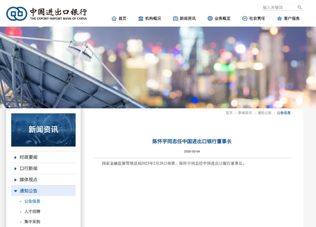据中国进出口银行消息,3月4日,中国进出口银行发布公告称,国家金融监督管理总局2025年2月28日核准,陈怀宇任中国进出口银行董事长。