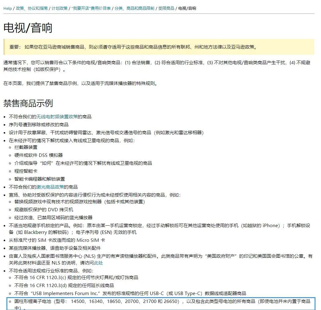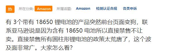 近日,有卖家反馈称,带有18650 锂电池的三条产品listing,突然变狗。联系亚马逊说是因为含有18650电池,所以直接禁售不让卖。直接禁售所有圆柱形锂电池的政策太荒唐了,因为这个波及面非常广!
