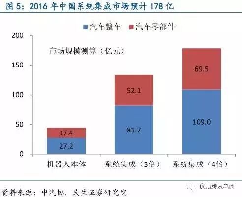 根据中汽协数据,2015年汽车整车、零部件制造业固定资产投资额分别为2724.16 亿、8685.49亿,若按整车及零部件行业机器人占固定资产投资额比值分别为1%、0.2%来估计机器人本体市场规模,并在此基础上估计系统集成市场规模,则2016年系统集成市场空间就已达134-178亿。