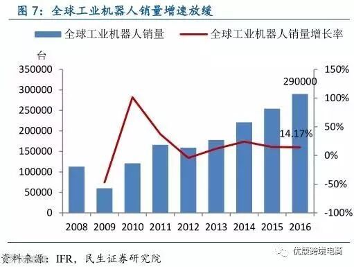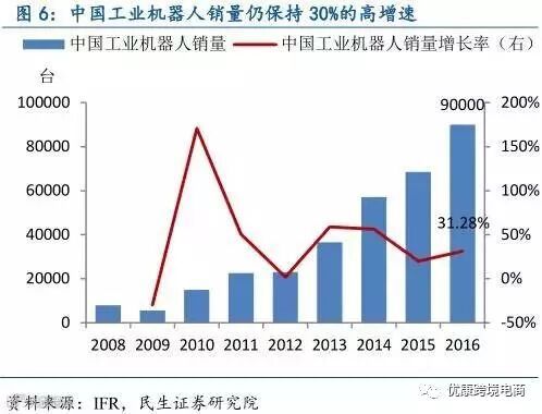 工业机器人销量得到快速提升。由于人工成本的增加和产业转型升级的需求,我国的工业机器人自2010年始,表现了大幅增长,此后销量增速保持在20%-50%的较高水平。