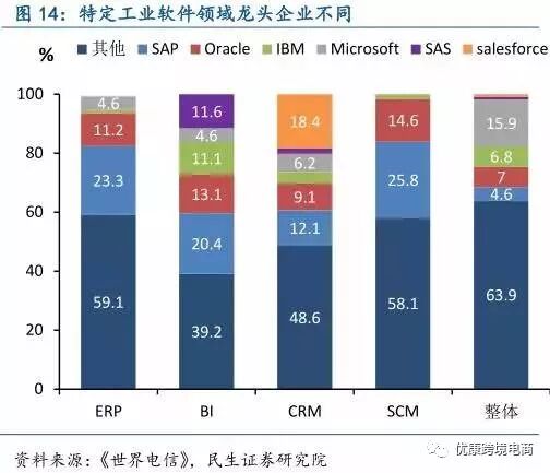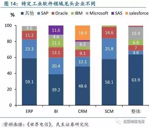 其中ERP软件产业格局相对稳定,SAP和Oracle两家企业占据主导,属于一线ERP软件,Infro、Sage、Microsoft隶属二线;在CRM领域中,Salesforce 占据全球CRM市场第一位,且发展迅速,其成功来自基于SaaS的云服务模式;