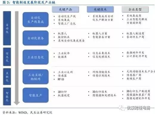 我国目前仍处于“工业2.0”(电气化)的后期阶段,“工业3.0”(信息化)还待普及,“工业4.0”正在尝试尽可能做一些示范,制造的自动化和信息化正在逐步布局。