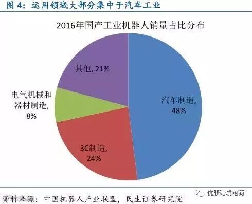根据中国机器人产业联盟的数据,2016年上半年国产工业机器人应用行业进一步拓宽至农副食品加工业,酒、饮料和精制茶制造业,医药制造业,餐饮业等,较2014年增加6个行业中类、21个行业小类;