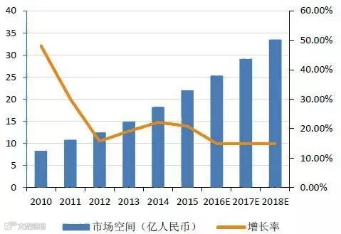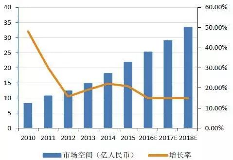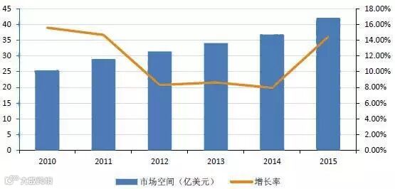 全球机器视觉部件及系统市场空间从2010年的25.2亿美元增长到2015年的42亿美元,年复合增长率为10.8%。