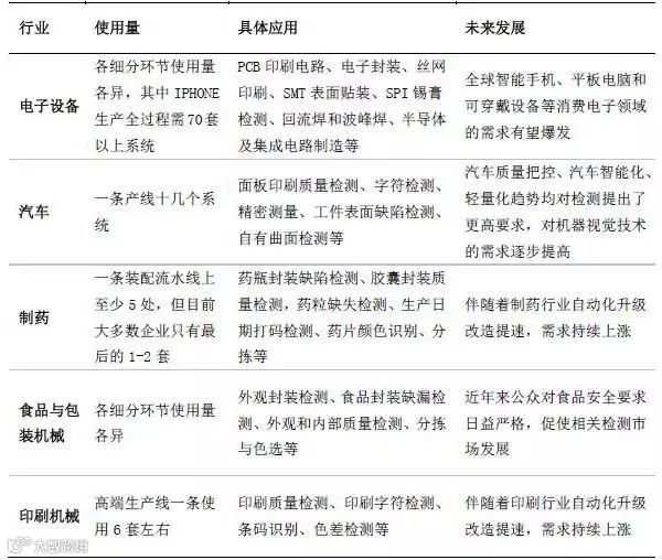 工业机器人领域的机器视觉下游市场主要是半导体及电子制造、汽车、食品与包装和制药行业,其他如烟草、农业、机械零部件等也是机器视觉应用的重要行业。