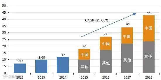2012-2018全球及中国扫地机器人市场空间预测(亿美元)