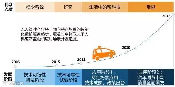 根据麦肯锡、高盛的预测,在2022年左右,会出现呈一定规模的的无人驾驶汽车应用趋势。到2030年左右,无人驾驶汽车将进入汽车消费市场。