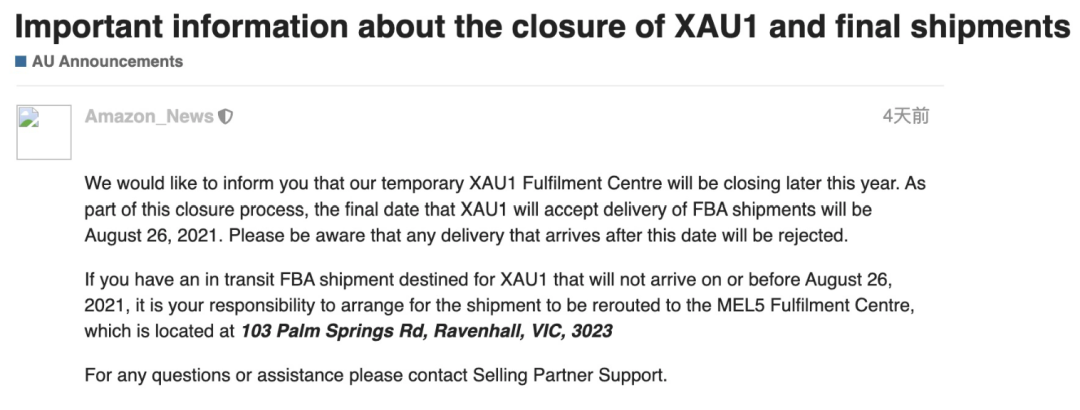 宣布其仓库XAU1将在8月26日后停止收货,提醒卖家转移货物。