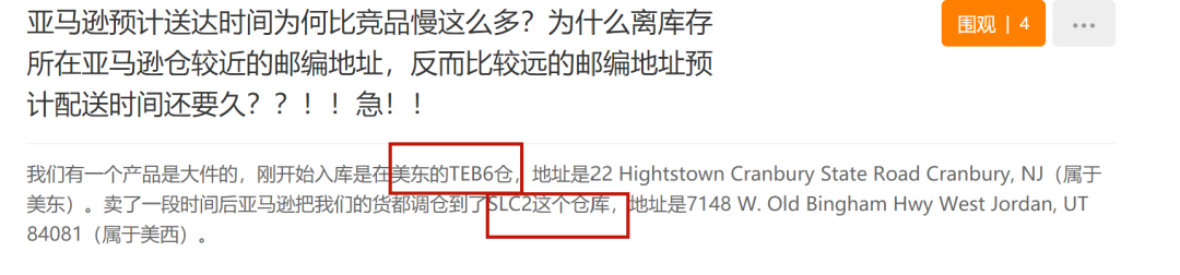 无独有偶,也有一位卖家也反馈了类似的情况。该卖家一产品刚开始在美东的TEB6仓入库,销售一段时间后亚马逊将货物都调仓到了美西的SLC2仓库。