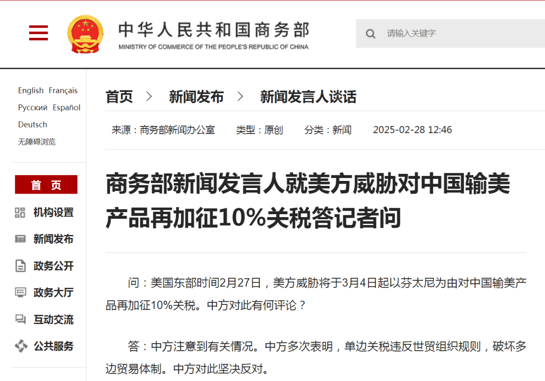问:美国东部时间2月27日,美方威胁将于3月4日起以芬太尼为由对中国输美产品再加征10%关税。中方对此有何评论?